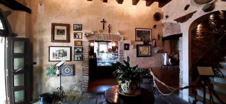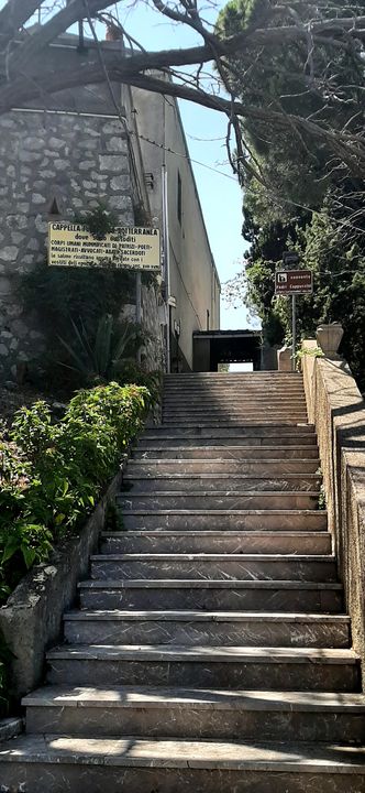 Nous avons toutefois terminé notre visite du village en nous rendant au Convento dei Cappuccini, par la Via éponyme. Le Mont Calvaire porte bien son nom … Il y a d’ailleurs un chemin de croix ! C’est un ancien ermitage perché en haut de la crête, transformé en église par les jésuites au XVIIIe siècle. Vous sonnerez à la porte dont la photo est ci-dessous et pour quelques pièces (laissé à votre appréciation), vous pourrez observer les momies de personnages du début du XIXe siècle. Par respect, les photos sont interdites. Vous pourrez ensuite vous rendre dans l’église ainsi que sur la terrasse la jouxtant d’où vous jouirez une fois de plus d’une magnifique vue !