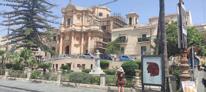 C’est donc sous un soleil de plomb (42°C) que nous entrons par la Porta Reale dans la petite Noto dans le magnifique Corso Vittorio Emanuele III. Derrière, sur un boulevard planté d’arbres, se dessine un très joli jardin public.