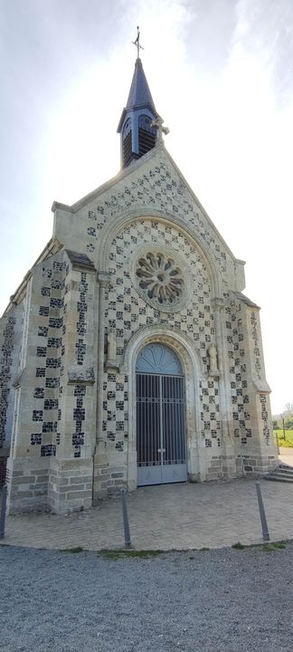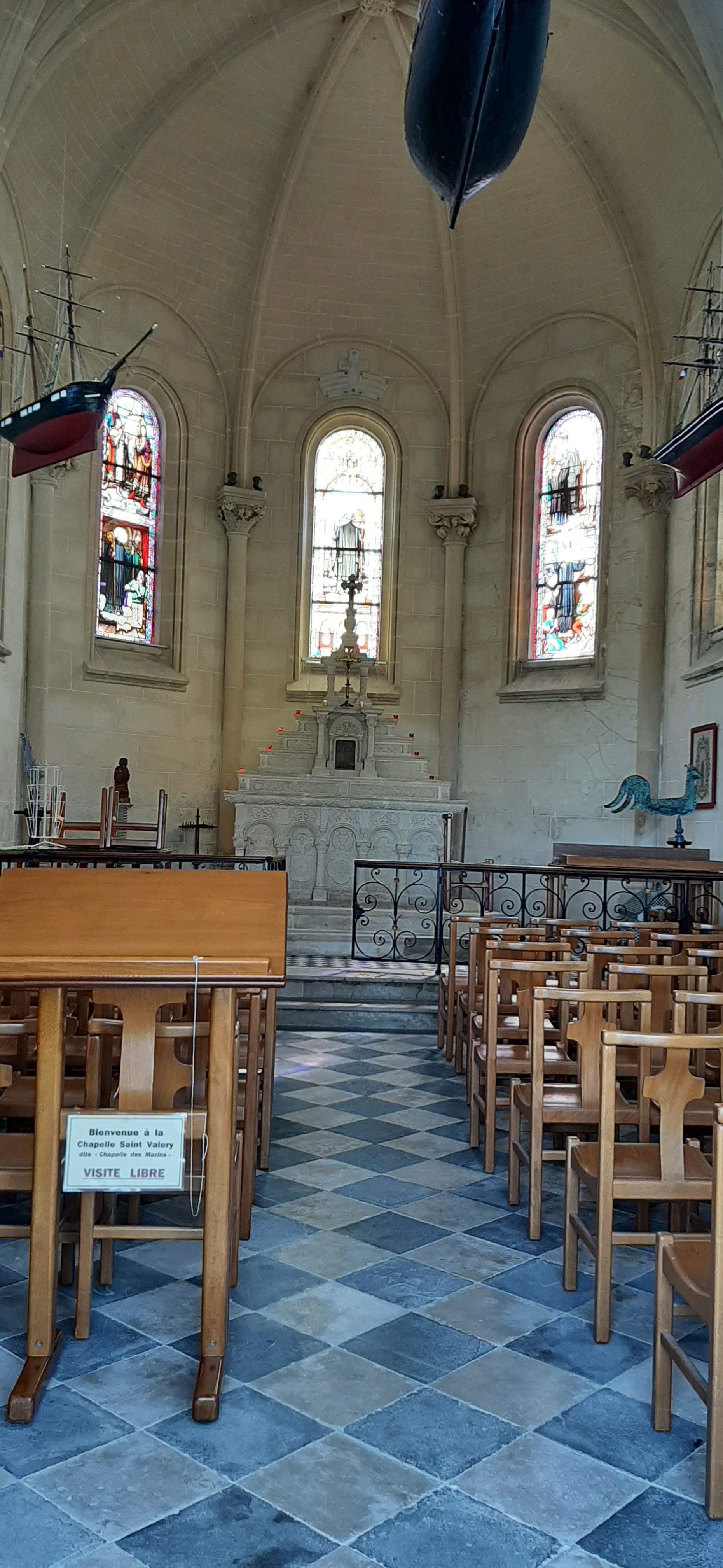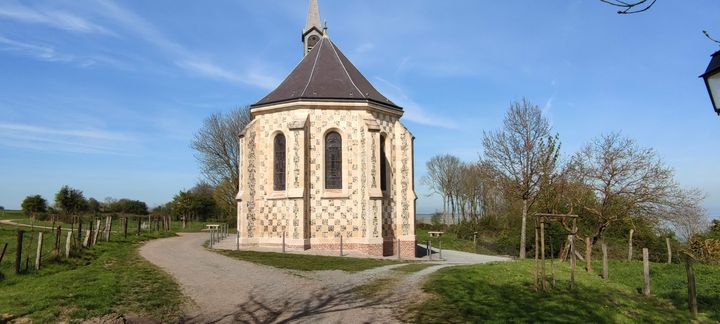 Et puis, après avoir pris un petit chemin longeant de vieilles bâtisses et fermes, nous atteignons le premier but de notre visite : la Chapelle des Marins. Edifiée à la mémoire de Valery de Leuconay, reconnu fondateur de Saint-Valery sur Somme (et pourtant originaire d’Auvergne…), elle est un point de repère pour tout qui se trouve dans la région. Petite mais scintillante, elle trône sur le dessus de la colline.