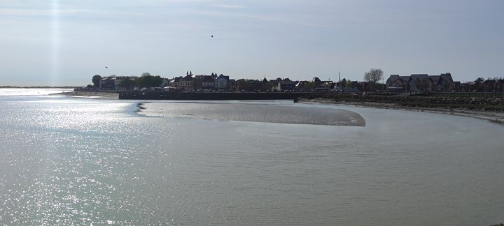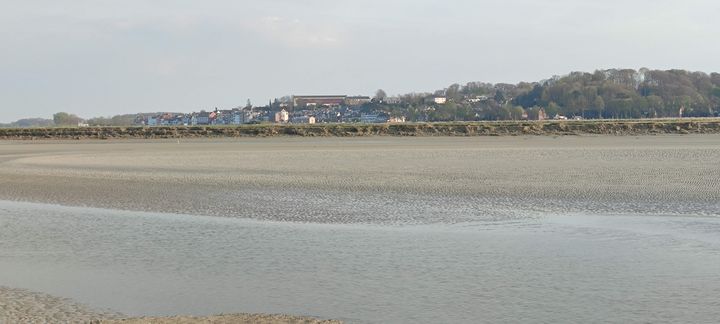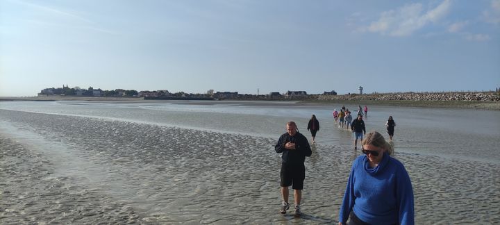 Descendus du train, une petite marche de quelques minutes nous mène à la baie en pleine marée basse (oui sinon on n’appelle pas cela traversée à pied mais au secours je ne sais pas nager … :)) où nous apercevons, au loin, Saint-Valery 🙂