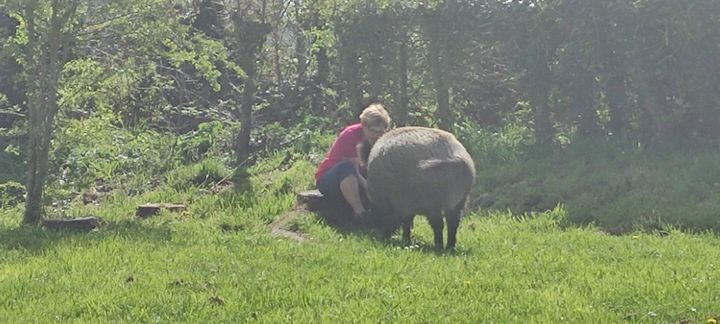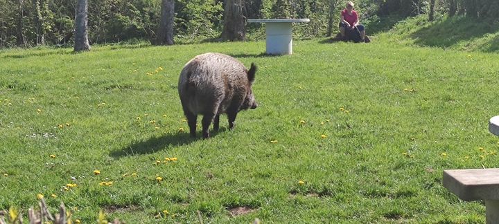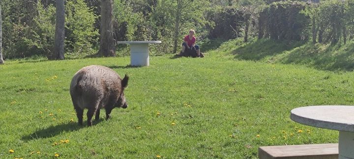 Titine, splendide laie qui resplendit de forme et de calme apparent, déambule dans la pelouse jouxtant la chapelle. Mieux, elle répond aux appels d’une habituée qui la fréquente tous les jours (et lui donne un peu à manger …) depuis plusieurs années. Les deux semblent réellement se parler, les grognements répondant aux paroles douces de sa « tante ». Joli spectacle MAIS n’oublions jamais qu’il reste quand même un animal sauvage et donc imprévisible.