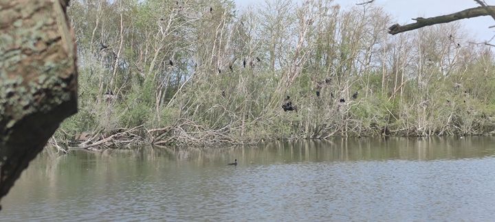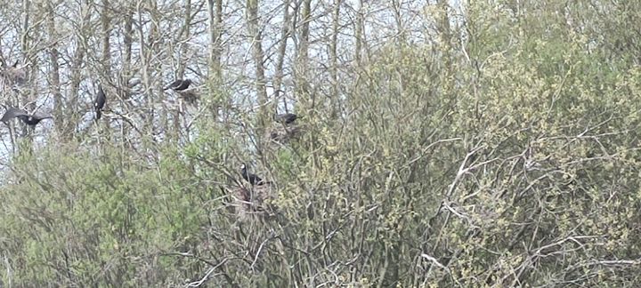 Nous nous arrêtons un long moment pour observer le vol incessant des Grands Cormorans à la recherche de petites branches pour confectionner le nid. Un vol plané au dessus de l’eau, une acrobatie et hop le voici offrant à sa belle le fruit de ses trouvailles. On le dit silencieux mais nous pouvons vous assurer qu’il n’en est rien.